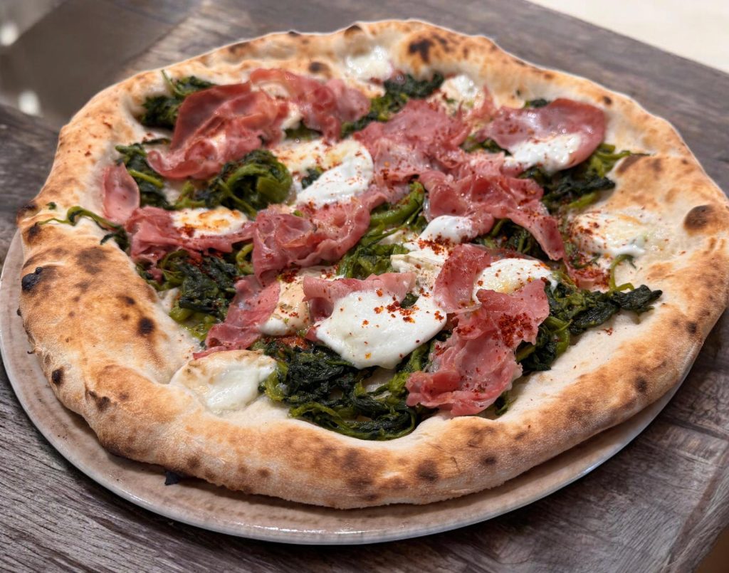 Pomodoro “Così Com’è”, fiordilatte di Agerola, salame piccante di Bracigliano, funghi Champignon, prosciutto arrosto alta qualità “Diamante Nero”, olio evo Madonna dell’Olivo9,5