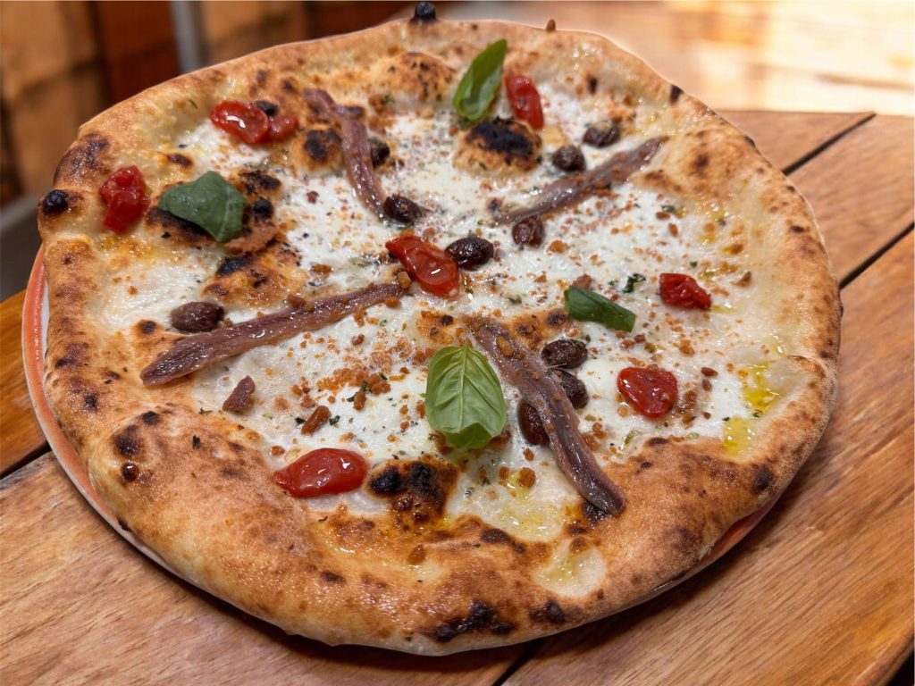 Fiordilatte di Agerola, pomodorini del piennolo del Vesuvio, olive infornate di Ferrandina e acciughe del Cantabrico si incontrano su una base soffice e profumata. Il tocco finale del pane condito e tostato esalta i sapori mediterranei,